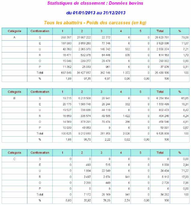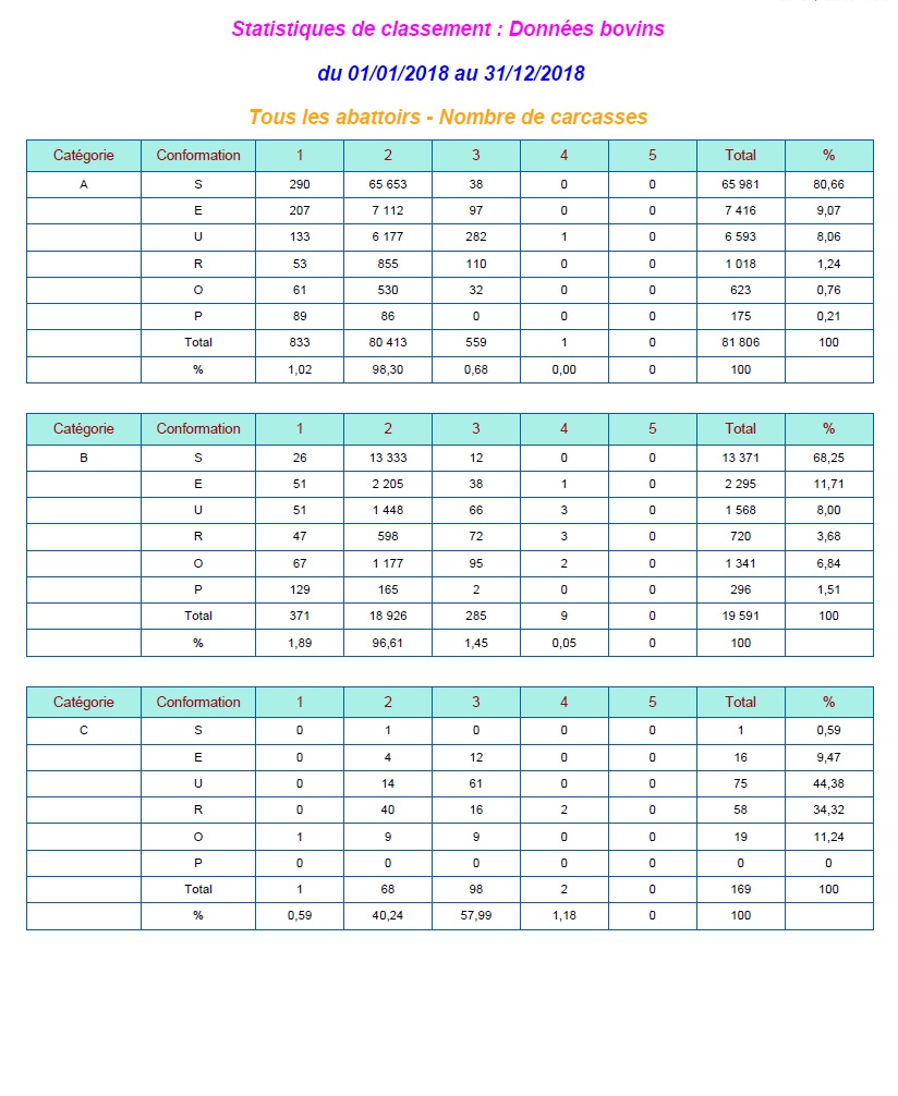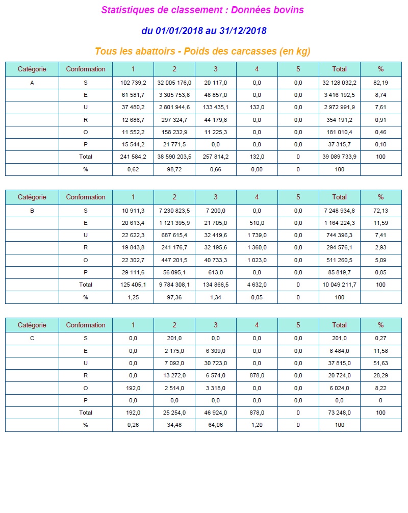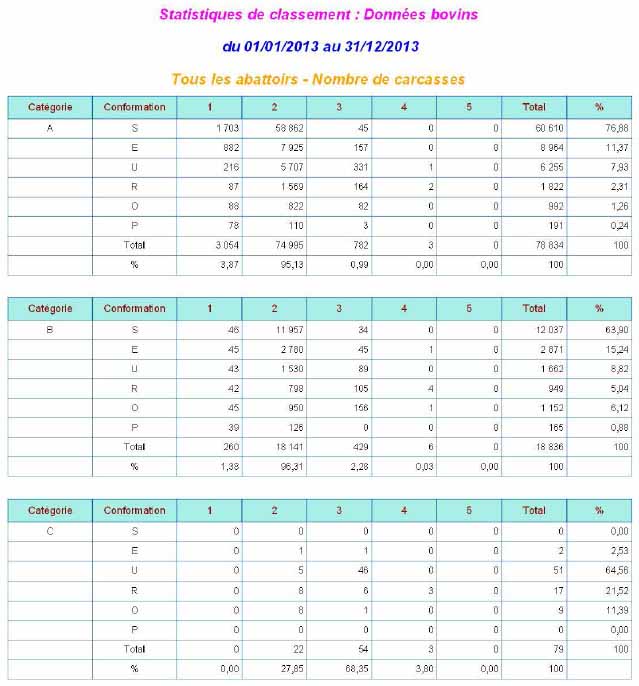 Pourcentage des classes de Conformation / Engraissement dans les Catégoriess A / B / C