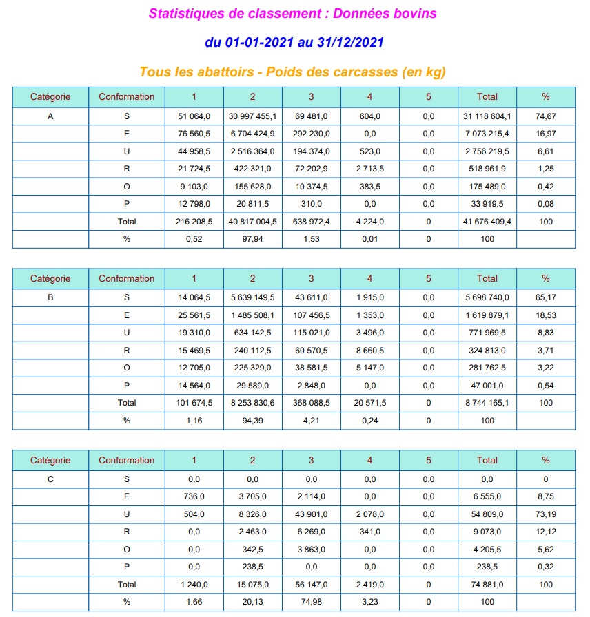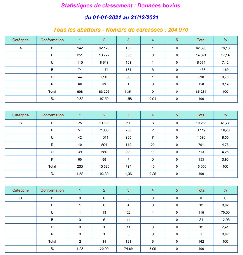 Pourcentage des classes de Conformation / Engraissement dans les Catégoriess A / B / C